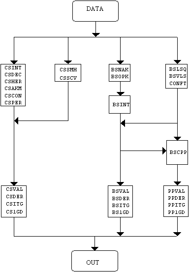 For more advanced uses of the interpolation (or least squares) spline routines, one first forms an interpolant from interpolation (or least-squares) data. Then it must be evaluated, differentiated, or integrated once the interpolant has been formed. One way to perform these tasks, using cubic splines with the ‘not-a-knot' end condition, is to call CSINT to obtain the local coefficients of the piecewise cubic interpolant and then call CSVAL to evaluate the interpolant. A more complicated situation arises if one wants to compute a quadratic spline interpolant and then evaluate it (efficiently) many times. Typically, the sequence of routines called might be BSNAK (get the knots), BSINT (returns the B-spline coefficients of the interpolant), BSCPP (convert to pp form), and PPVAL (evaluate). The last two calls could be replaced by a call to the B-spline grid evaluator BS1GD, or the last call could be replaced with pp grid evaluator PP1GD. The interconnection of the spline routines is summarized in Figure 3-2.