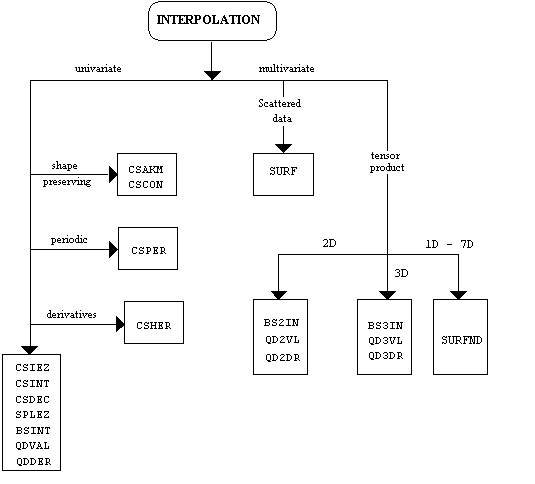 The choice of an interpolation routine depends both on the type of data and on the use of the interpolant. We provide 19 interpolation routines. These routines are depicted in a decision tree in Figure 3-3. This figure provides a guide for selecting an appropriate interpolation routine. For example, if periodic one-dimensional (univariate) data is available, then the path through univariate to periodic leads to the IMSL routine CSPER, which is the proper routine for this setting. The general-purpose univariate interpolation routines can be found in the box beginning with CSINT. Multidimensional tensor-product interpolation routines are also provided. For two-dimensional scattered data, the appropriate routine is SURF.