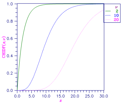 Function CHIDF evaluates the cumulative distribution function, F, of a chi-squared random variable with DF degrees of freedom, that is, with v = DF, and x = CHSQ,