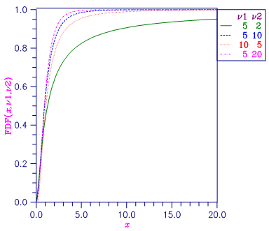 Function FDF evaluates the distribution function of a Snedecor's F random variable with DFN numerator degrees of freedom and DFD denominator degrees of freedom. The function is evaluated by making a transformation to a beta random variable and then using the routine BETDF. If X is an F variate with v1 and v2 degrees of freedom and Y = v1X/(v2 + v1X), then Y is a beta variate with parameters p = v1/2 and q = v2/2. The function FDF also uses a relationship between F random variables that can be expressed as follows.