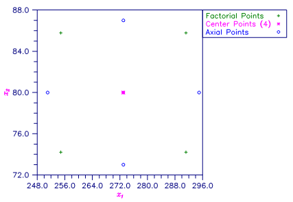 This example uses two variables and their respective minimum and maximum values to generate an orthogonal central composite design with four center points.