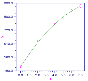 Routine RCURV computes estimates of the regression coefficients in a polynomial (curvilinear) regression model. In addition to the computation of the fit, RCURV computes some summary statistics. Sequential sums of squares attributable to each power of the independent variable (stored in SSPOLY) are computed. These are useful in assessing the importance of the higher order powers in the fit. Draper and Smith (1981, pages 101−102) and Neter and Wasserman (1974, pages 278−287) discuss the interpretation of the sequential sums of squares. The statistic R2 (stored in STAT(5)) is the percentage of the sum of squares of y about its mean explained by the polynomial curve. Specifically,