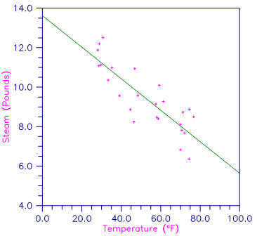This example fits a line to a set of data discussed by Draper and Smith (1981, Table 1.1, pages 9−33). The response y is the amount of steam used per month (in pounds), and the independent variable x is the average atmospheric temperature (in degrees Fahrenheit).