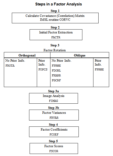 Once the factor loadings have been extracted and rotated (if desired), estimates for the hypothesized underlying factors can be computed. First, one of several available methods in routine FCOEF is used to compute the factor score coefficients. Routine FSCOR is then called with these factor score coefficients to compute the factor scores.