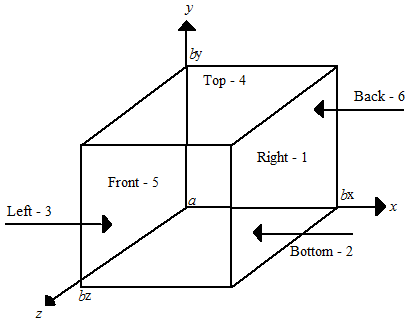on the domain (ax, bx) × (ay, by) × (az, bz) (a box) with a user-specified combination of Dirichlet (solution prescribed), Neumann (first derivative prescribed), or periodic boundary conditions. The six sides are numbered as shown in the following diagram.