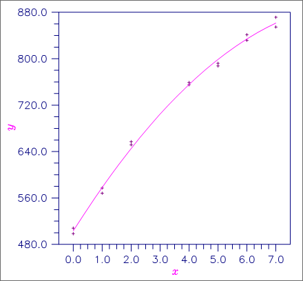 Routine RCURV computes estimates of the regression coefficients in a polynomial (curvilinear) regression model. In addition to the computation of the fit, RCURV computes some summary statistics. Sequential sums of squares attributable to each power of the independent variable (stored in SSPOLY) are computed. These are useful in assessing the importance of the higher order powers in the fit. Draper and Smith (1981, pages 101− 102) and Neter and Wasserman (1974, pages 278−287) discuss the interpretation of the sequential sums of squares. The statistic R2 (stored in STAT(5)) is the percentage of the sum of squares of y about its mean explained by the polynomial curve. Specifically,