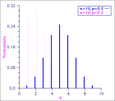 To avoid the possibility of underflow, the probabilities are computed forward from 0, if k is not greater than n times p, and are computed backward from n, otherwise. The smallest positive machine number, ɛ, is used as the starting value for computing the probabilities, which are rescaled by (1 – p)nɛ if forward computation is performed and by pnɛ if backward computation is done.