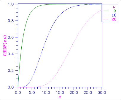 Function CHIDF evaluates the cumulative distribution function, F, of a chi‑squared random variable with DF degrees of freedom, that is, with ν = DF, and x = CHSQ,