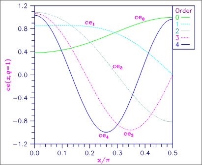 Evaluates a sequence of even, periodic, integer order, real Mathieu functions.