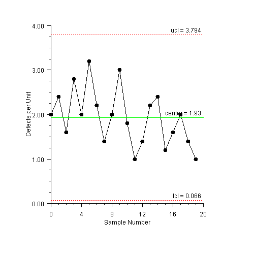 The number of defects in the manufacturing of computers was measured. There were 20 samples, each containing 5 computers. The center line is at 1.93, the average number of defects per computer (Montgomery 318).