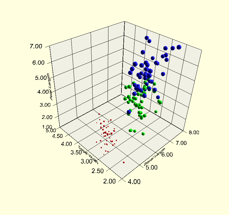 The classic Fisher iris data is plotted in this chart. This example shows use of the 3D marker type. A sphere has been chosen in this example to highlight data points.