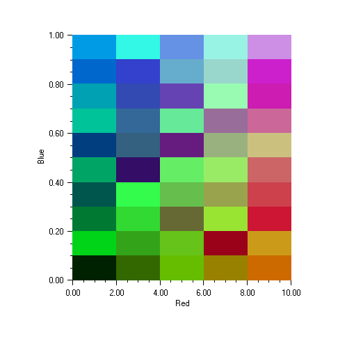 objects is created by linearly interpolating red along the x-axis, blue along the y-axis and mixing in a random amount of green. The data range is set to [0,10] by [0,1].