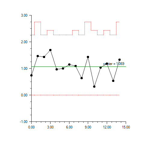During a manufacturing process 15 samples, each containing 3 to 5 items, were measured. An R chart was contructed from the 15 sample ranges. Since the sample sizes are unequal the upper control limit is a stair step line.