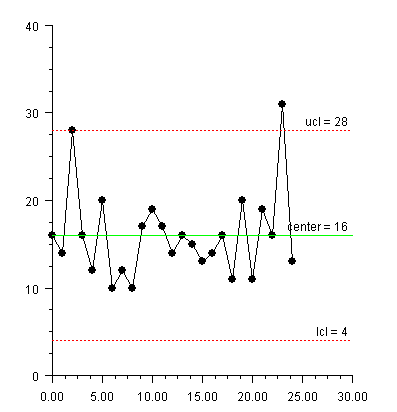 The number of defects on each of 25 successive wafers is plotted. The data is from NIST Engineering Statistics Handbook: Counts Control Charts