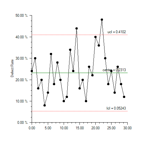 The location of 50 chips on each of 30 successive wafers is measured. The number of defects is the number of horizontal or vertical misregistrations of chips. The data is from NIST Engineering Statistics Handbook: Proportions Control Charts