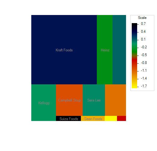 A treemap is constructed from business analytics data. The area is proportional to the company's sales volume and the color scale maps to a performance indicator. The raw data are unsorted and must be sorted by the area values before creating the chart.